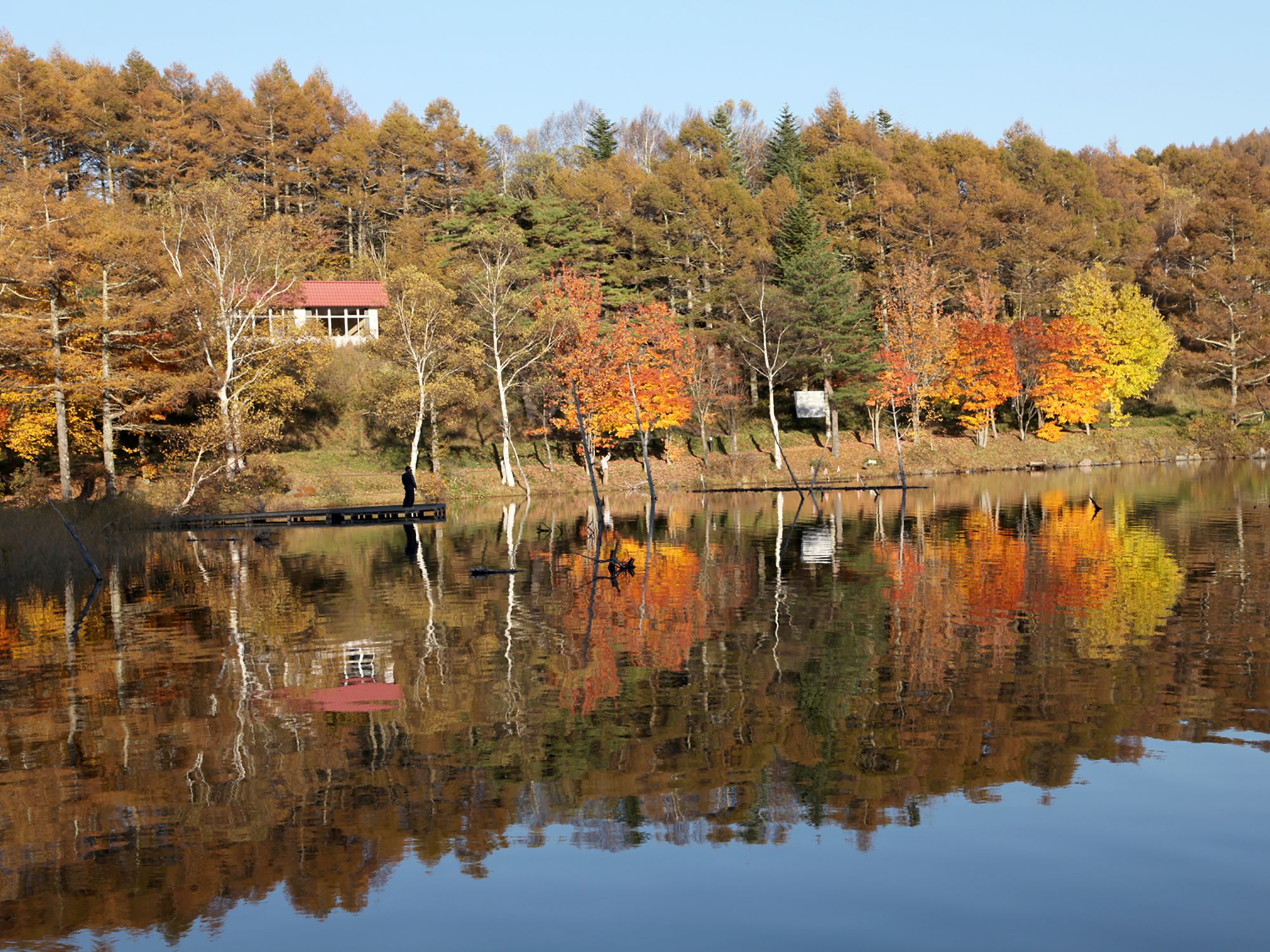 さあ満足、出発だ。白樺湖から山道を5㎞ほど走ると店の並ぶ集落が現れた、そして周辺を美しい紅葉に囲まれた女神湖が見えてくる。湖面はとても静かでまるで眠っているようだ。グルッと一周する道があるようなので走ってみることにする。横目で湖を見ながら走っていると、湖に紅葉が鏡のように映っていた。この景色を写真に収めておこう思い、バイクを止めてカメラを向ける。「本当にきれいだなあ…」これは今、この時期にしか見ることのできない特別な風景を記憶に刻み込んだ。