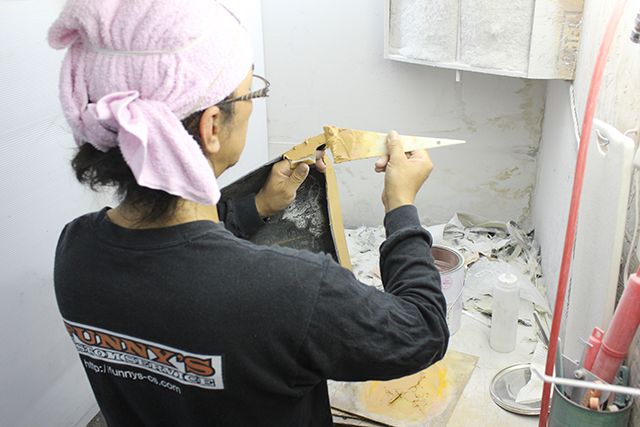 ボール紙を切って原型の元となる形状を作り上げていきます。出来上がったら上にFRPを貼っていくので、ボール紙といってもある...
