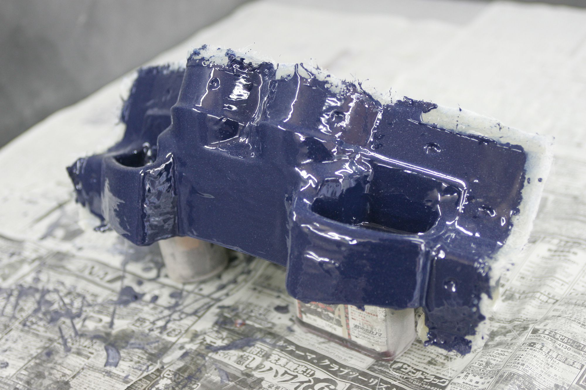 FRPを貼る前にガラスパテをダボ穴や入り組んでいる部分に塗り付けておきます。FRPが入りにくい部分にガラスパテを前もって塗り付けておくことで、カタの崩れやエアホールを防止するのです。
