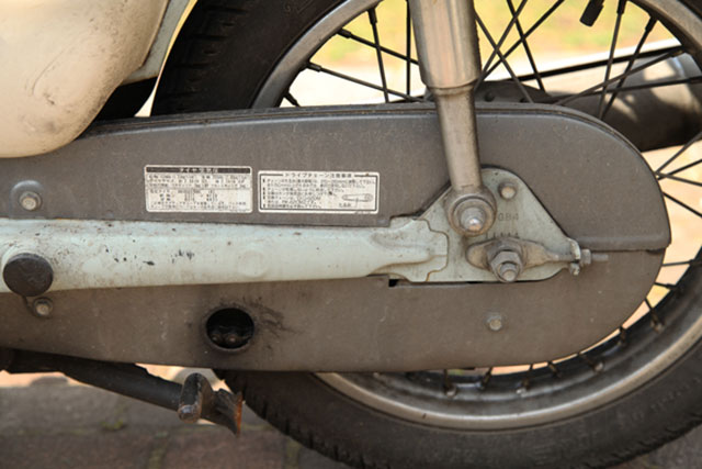 これがリトルカブ屈指のスグレモノ。このカバーが付いているとチェーンにゴミやホコリが付きにくくなりチェーンの寿命が延びる。またチェーンに吹き付けたオイルもケースの外に飛び散らないので汚れない。チェーンの延び具合は丸窓から確認、摘んで延びていたら調節。また、チェーンの調整を怠って延びたままにしておくと、カバーの中からシャリシャリ音が聞こえ始める、限界が近い証拠なのでそんなときは早めに調節する。