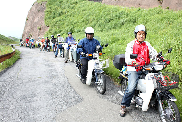 僕が阿蘇ライダーハウスに泊まっていた日に、偶然にも西日本のカブライダー集まりカブ主総会が行われた。僕も偶然リトルカブで旅行中で宿泊していたということで急遽カブ主として飛び入り参加することになった。参加者みんな一緒に阿蘇山周辺を走った。10台以上のバイクで走ることなんてほとんどないので、とても不思議な感じだった。大観峰での記念撮影にも参加した!!