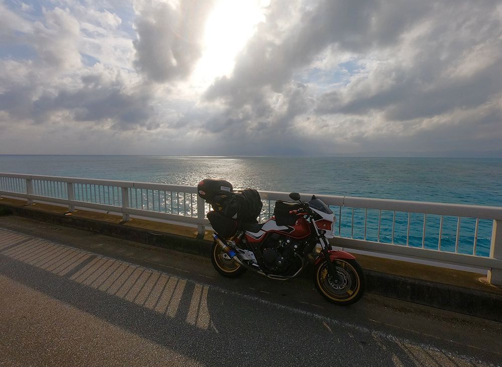 当初、行く予定はなかったのですが、鹿児島からのフェリーで一緒になったバイク乗りの人にすすめられて行きました。特に島へ渡る橋の上から見る景色と海がとてもきれいでした。海の上を渡る橋を走るのは初めてだったので、本当に感動しました。それから次に沖縄へ来るときは必ず水着を持っていきます(笑)