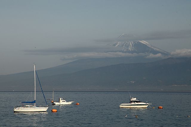 沼津から南下。江浦港を過ぎるとガラッと車が減った。海が見える気持ちのいい海岸線、駿河湾越しに見える富士山。絶景のピークは大瀬崎だが、展望台に着くと同時に、恥ずかしそうに頭を雲に隠してしまった。残念。