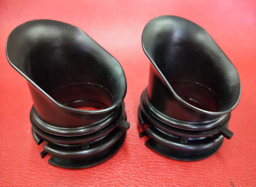 左が新品のコネクティングチューブで右が今まで使用していた古くなったもの。紫外線や寒暖などにやられて古くなるとカチカチになってしまい、柔軟性が失われます。そしてエアクリーナーボックスを付けたり外したりする工程で、しっかり入っていない状態でバンドを締めこんだりすると変形してしまったりも!