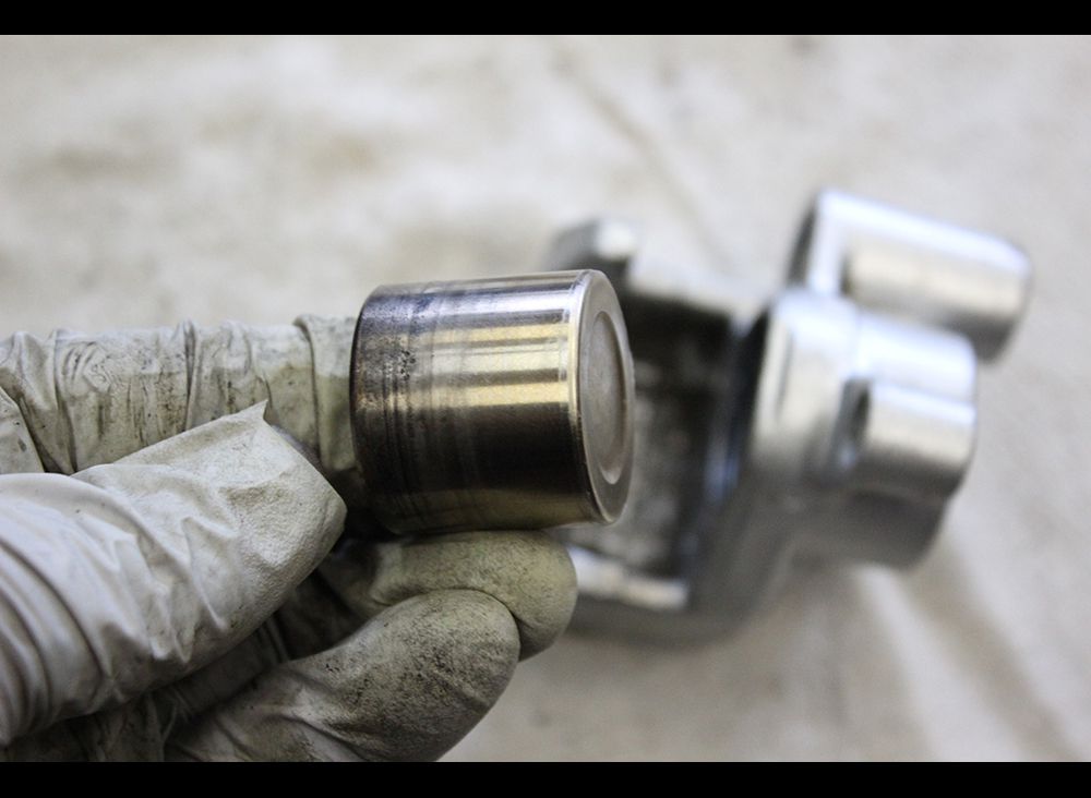 ピストンシールを装着します。このピストンシールがピストンに密着していることによって、ブレーキをかけてピストンが油圧で押し出された状態から元の位置にピストンを押し戻してくれるのです。ピストンの戻りが悪いとかブレーキが引きずっているといった症状の時にはここも疑うこと。