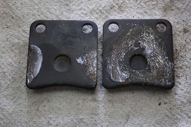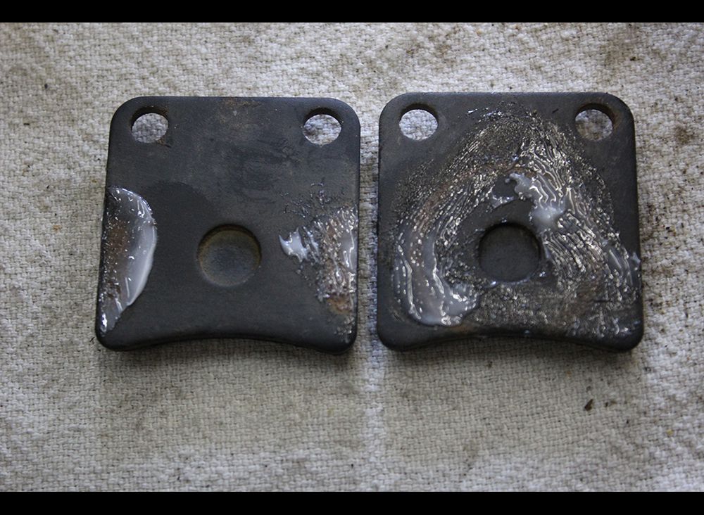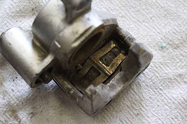 パッドをピンに押し付けているリテーナーも取り外す。これはツメが折れていたりクラックが入っていたら交換しますが、汚れているだけなので洗浄して再利用します。組むときは向きを間違えないように覚えておくこと。