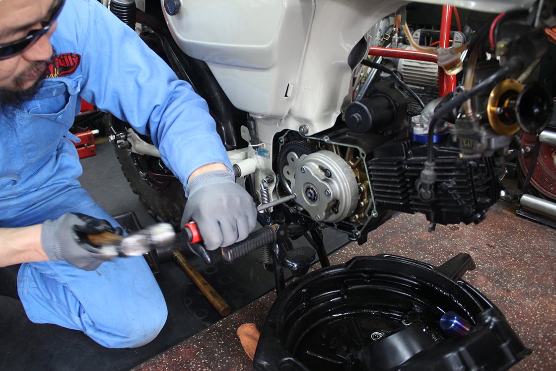 ボディはCD50なのですがR&Pの足周りを入れたことで外側にチェーンオフセットが必要になったことによりマグナ50のエンジンを乗せているという、少しややこしいカスタム車両に強化クラッチを組んでみます。50ccの車両を88ccなどにボアアップした時にも強化クラッチへの変更は必須ですから、他車種にも応用効きます。もちろん今回も阿佐ヶ谷の太洋モータースさんの場所と工具をお借りしての作業です!
