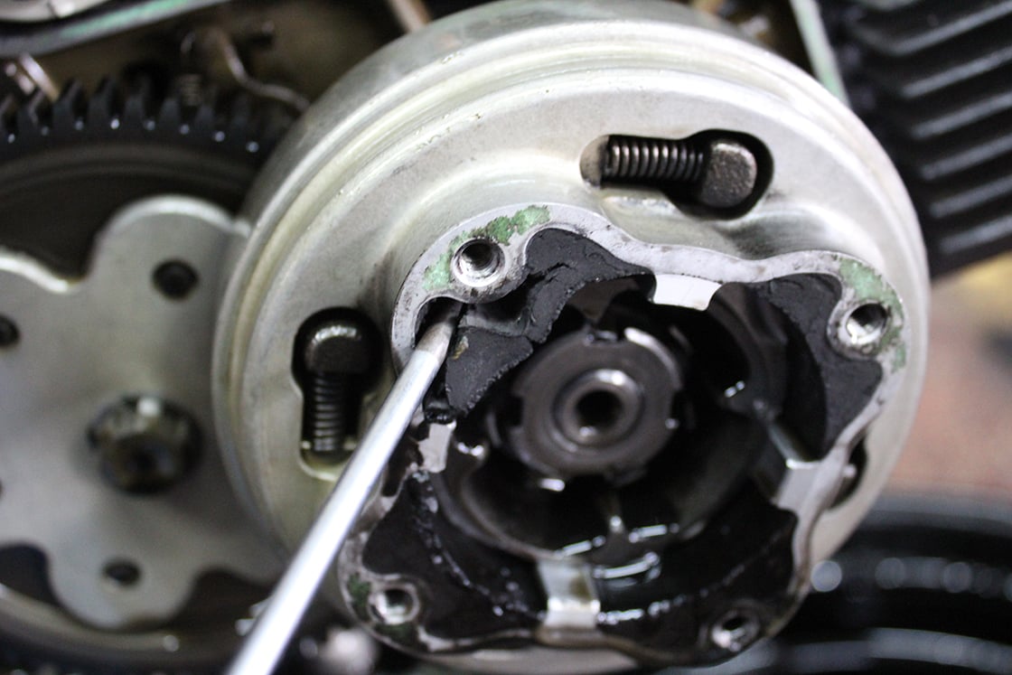 これでクラッチが取り外せました。横に寝かせればオイルを抜かなくてもできると言えばできますが、結局はオイルでビタビタになる。セコイこと言わずにオイルは先に抜いておく方が綺麗にかつ確実に作業ができますからね。