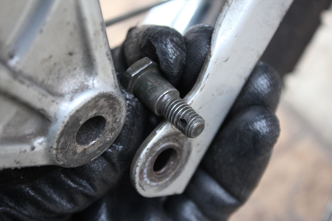 マフラーを外すのは簡単です。エキパイ側を一度緩めて、サイレンサー側を止めているピポットシャフトのナット緩める。その後、エキパイ側を外して床に落とさないように気を付けながらサイレンサー側を外せばOKです。