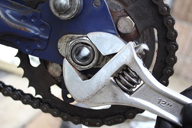 リアアクスルスリーブナットを外してスプロケットハブを取り外す。バイクでは30mmのレンチは大き過ぎて使う機会はほとんどないという人が多いでしょう。プレスカブオーナーなら30mmレンチを用意しておくのがベストですが、メガネレンチもソケットも手元になかったのでモンキーレンチで代用です。