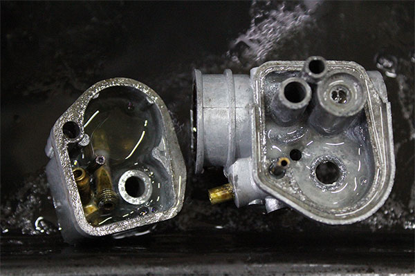 ボディ側にもキャブレタークリーナーを吹いてしばらく放置します。各種経路などにもしっかりと行き渡らせるようにすることが大事です。ジェット類はフロート室の中に浸したキャブクリーナー液の中に沈めておきましょう。