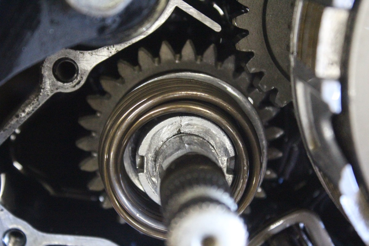 カバーを開けてみたらキックギア関係がなんだかおかしな様子。開ける前から「リターンスプリングが外れたor千切れたのでは?」という予想はしていましたが、なんだかいろいろクラックやら擦り減りやらが...。