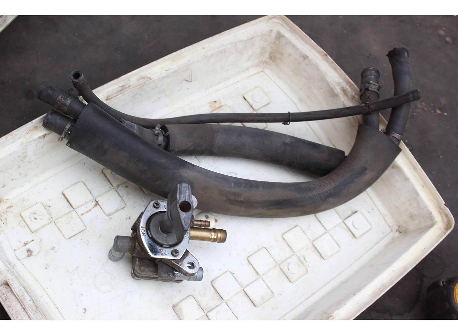 3MAに限らずですが、当時のヤマハ車はガソリンタンクの下にON/OFF切り替えのコックがまずあって、その先にもう一つリザーブなどを操作する負圧コックが付いている(3MAの場合はフレーム左サイド)。長期放置車の場合、コックは2つとも詰まっているだろうから掃除しておきます。