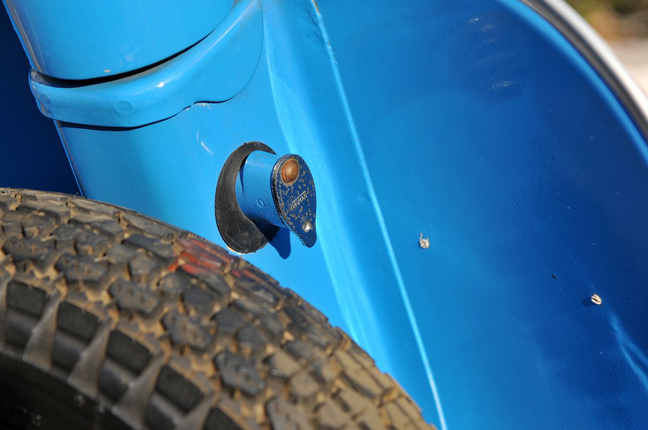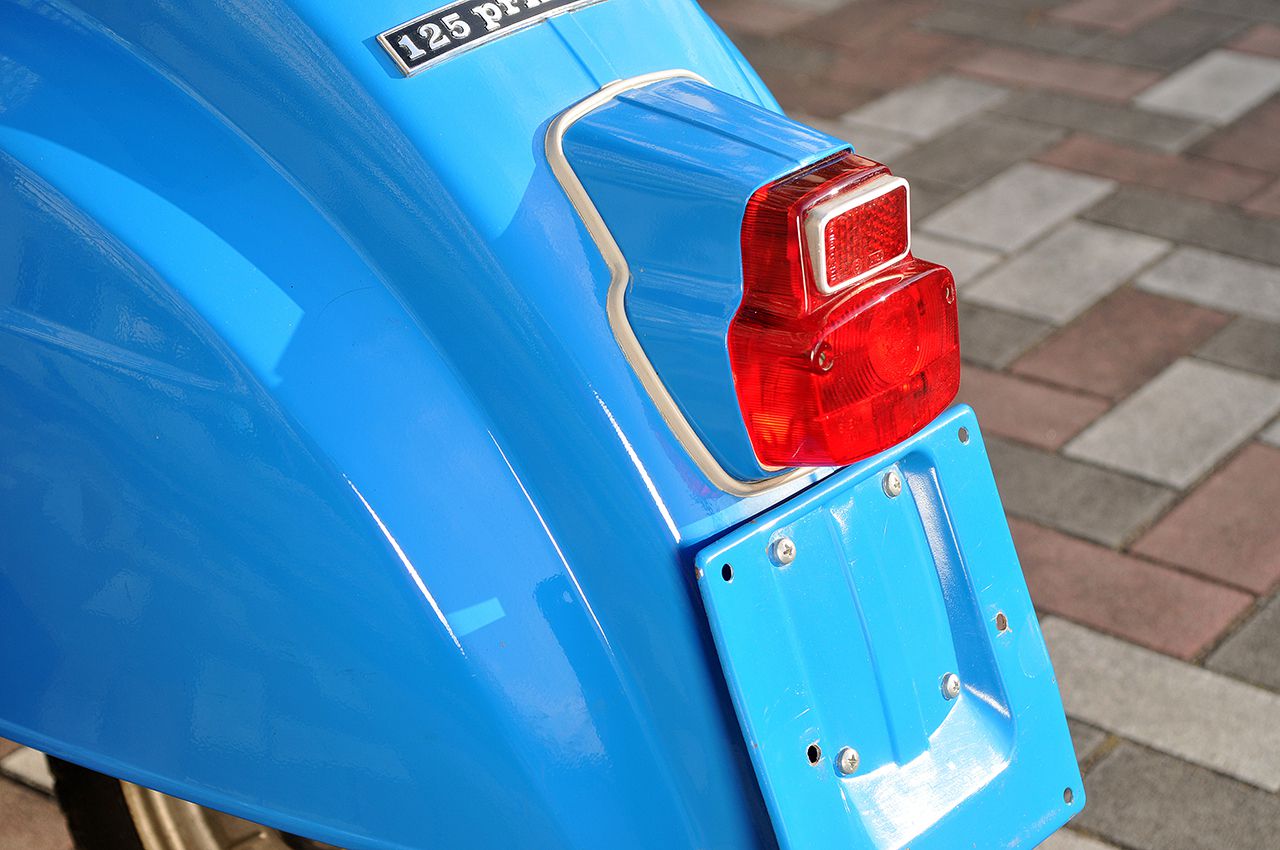 ちなみにプリマベーラは70年代半ばくらいにエンブレムデザインを意匠変更して、最終的に1983年まで生産されています。そこでこの意匠変更以前のモデルを第1世代、意匠変更以後のモデルを第2世代として分類することにします。 今回クローズアップするのは、そうした歴代プリマベーラの中でも第2世代となる125 Primaveraです。艶も十分に保たれたチャイナブルーの車体は、非常にいい状態で保存されていたことが伺える1台でしょう。