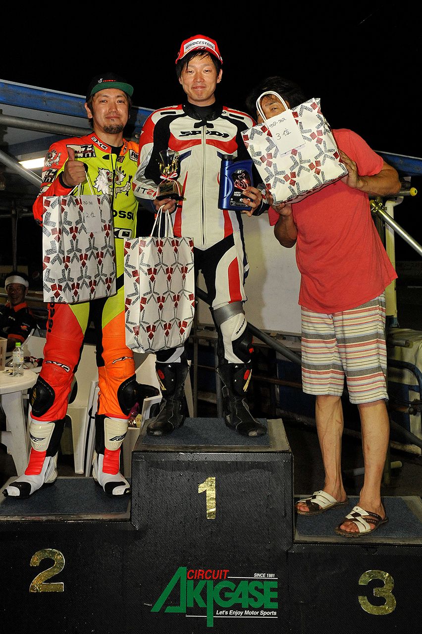 GP-Class・Winner◎表彰台左から順に2位:#1藤井選手、1位:#4野添選手、3位:#12中村選手、ブービー賞:#9菊地(栄)選手/Master-Class・Winner◎表彰台左から順に2位:#5菊地(信)選手、1位:#7牧野選手、3位:#74平山選手