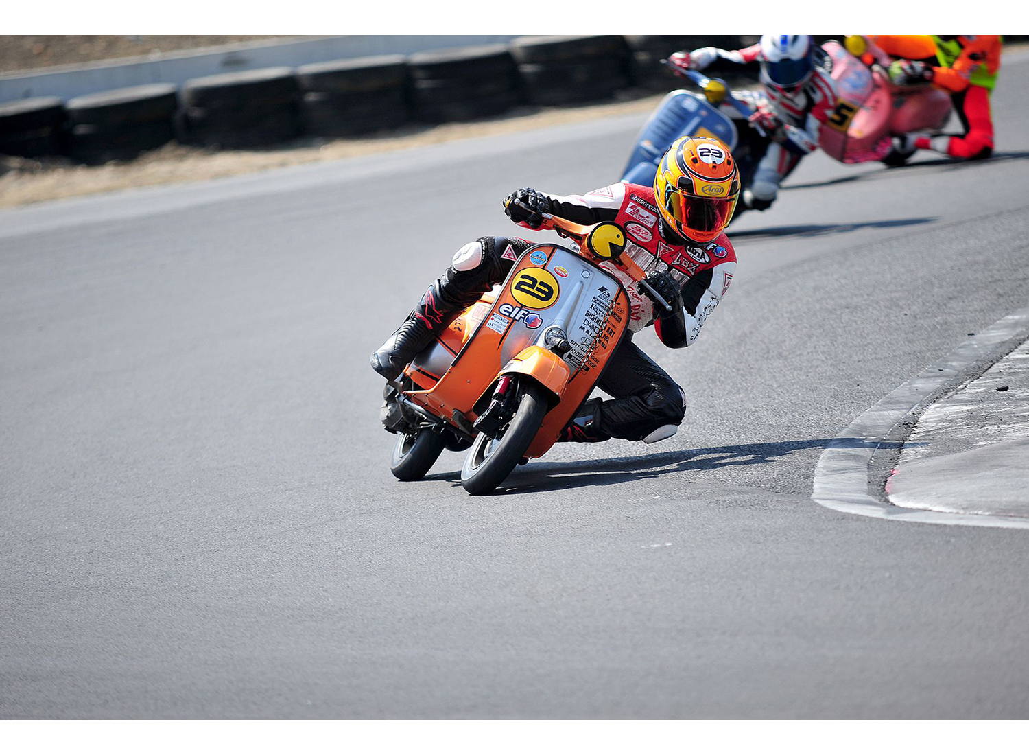 店長の尾西さんはスゴく気さくな面があり、意気投合。なのでベスパのメンテナンスをしてもらうだけではなく、お友達みたいな感じでお付き合いもスタート。気づけばだんだんベスパの車種も増え、そんなタイミングで「ベスパにはレースという楽しみもありますよ」という話に。大型バイクでのサーキット走行経験は何度かあったため、「試しにやってみようという感じで始めました」との事。