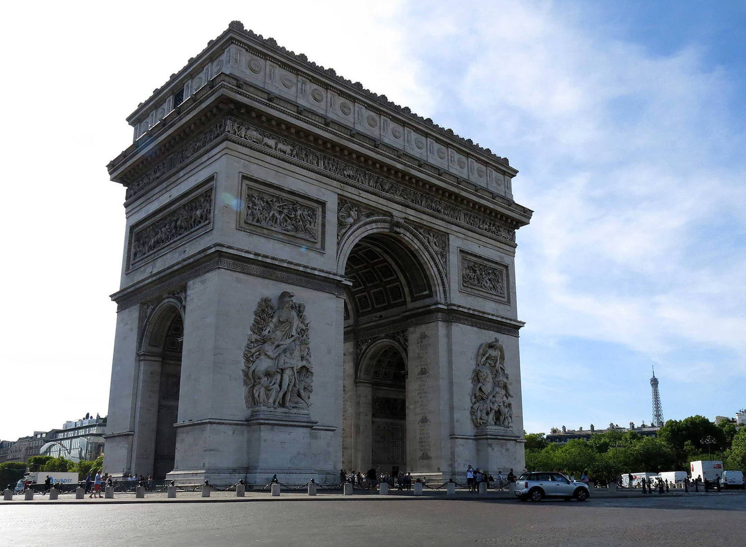 さて、各スポットを巡り、予定されている見どころで止まっては記念写真タイム。そんな流れのままエッフェル塔を横目に見つつ、いよいよ凱旋門へと差し掛かります。四方から集まる道路を通って、多くの自動車が凱旋門の周りを走り、それぞれの行きたい方向に抜けていくとても大きなラウンドアバウト。時折、自動車同士がクラクションを鳴らしていたりするので、歩道から見ているとこの大き目なラウンドアバウトを走るのには勇気がいると思うかもしれません。ですが、実際に車の流れに乗ってラウンドアバウトへと進入してみるとなんて事はなかったりします。