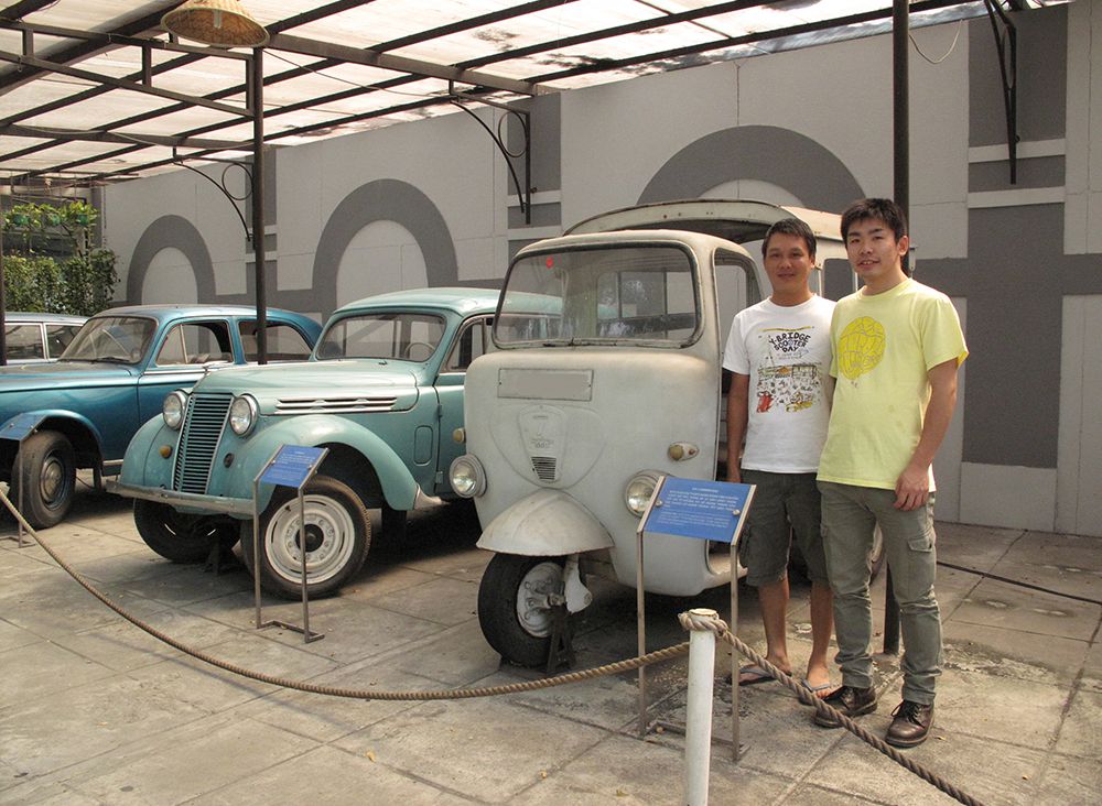 土田さんのベトナム旅をサポートしてくださったAnさん(左)と土田さんのツーショット。ホーチミン市博物館に屋外展示されているLamblettaの3輪カーゴトラックである、Lambroの前にて記念撮影した思い出の一枚。
