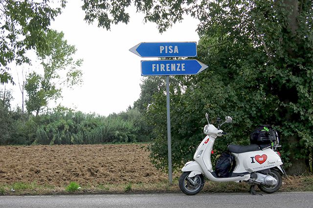 フィレンツェからポンテデーラに向かう道程は、分かりやすい国道が延びているのでその道路を利用します。フィレンツェの町を出て山を越えて行くと、トスカーナ地方のイメージでよく見られるいくつもの丘をなした景色が広がります。この日はとても天気が良く、ブドウ畑やオリーブ園などが広がる丘を視界に入れながら走る事が出来ました。ところがポンテデーラに到着する頃、なんとWi-Fiの調子が悪くなり電波を拾わなくなってしまいました。ナビを頼って宿まで辿り着こうと考えていたので、その計画がすべて崩れてしまったワケです。どうにかポンテデーラには到達出来ましたが、安堵感が半分、宿泊施設を探すための通信が出来ないという焦りも半分。しかも降り出した雨が次第に強くなってきたので、雨宿りをしながら策を練る事にします。